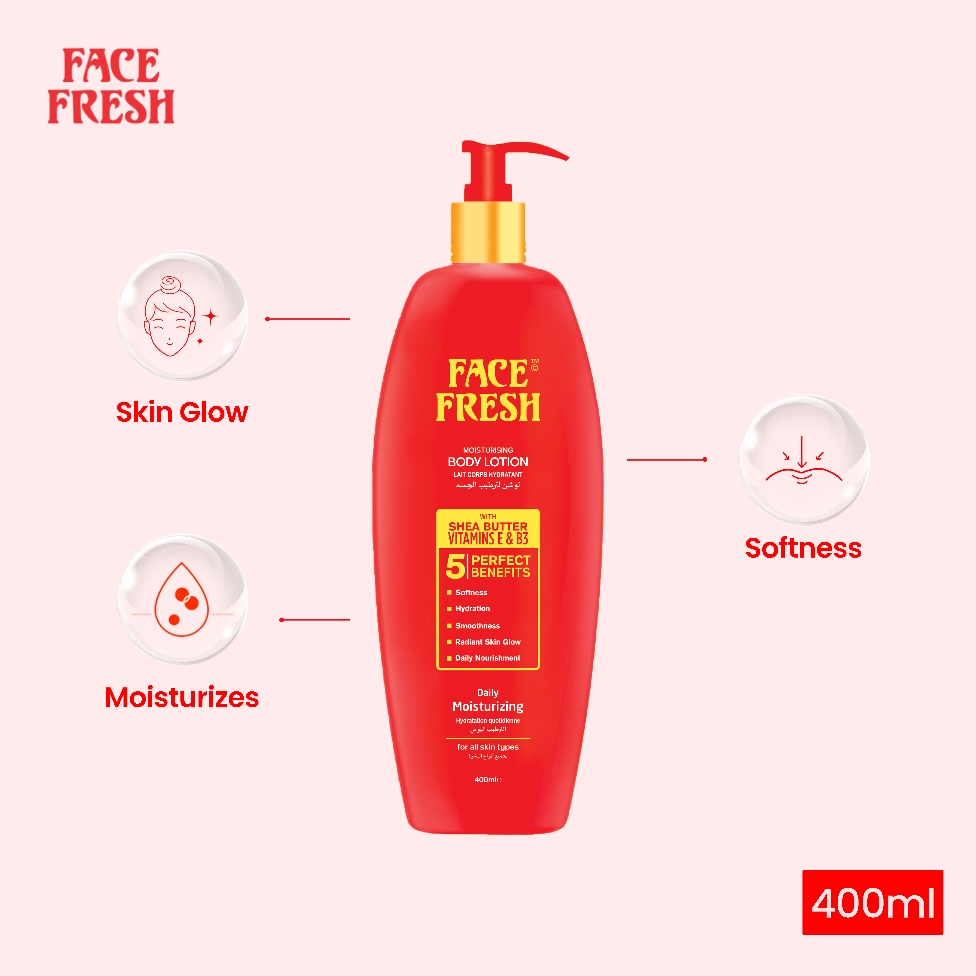 Face Fresh Body Lotion is designed to help lighten the skin and even out skin tone. It moisturizes the skin and prevents it from being dry. It works for all kinds of skin e.g. normal, sensitive, Dry, oily or combination Skin. The main ingredients in body lotion are humectants, which help to draw moisture into the skin, as well as emollients, which help to keep the moisture in.Â
