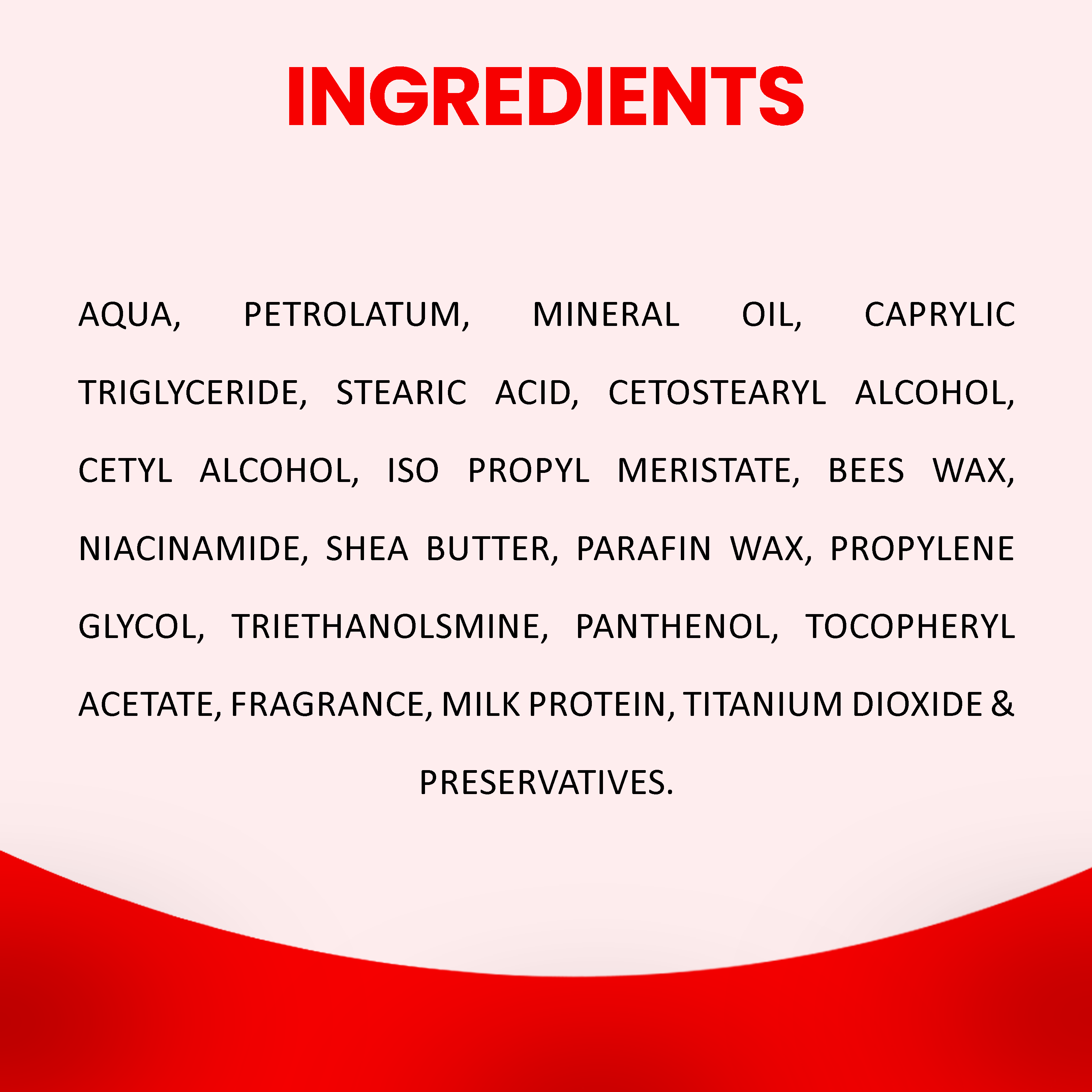 Ingredients: Aqua, Petrolatum, Mineral oil, Stearic acid, Cetyl alcohol, Cetostearyl alcohol, Crodex A, Beeswax, Vitamin 3, Methyl Paraben, Propyl Paraben, Paraffin Wax, Titanium Dioxide, TriethanolAmine & Fragrance.