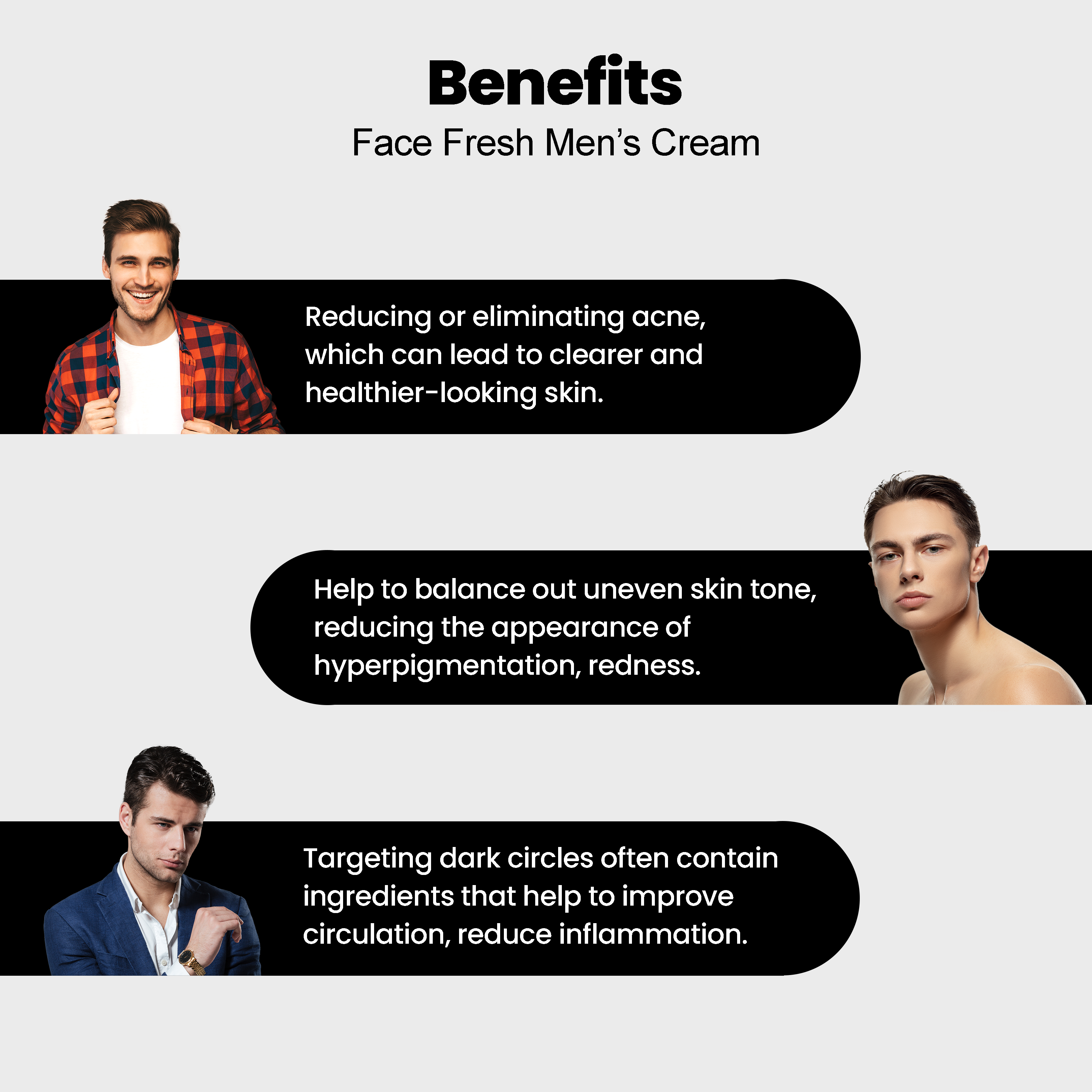 Description: Skin care is important for all men equally. So, the Face Fresh Beauty Cream for Men is specially formulated for men. It works to improve the appearance and health of skin. It typically includes ingredients that are formulated to provide hydration, reduce redness and inflammation, and help protect skin from environmental damage. Depending on the specific formula, this cream also provides exfoliating benefits, helps reduce the appearance of fine lines and wrinkles, and provides anti-aging benefits. This Cream has no side effects and it is equally suitable for all skin types including Dry, Oily and Combination.
