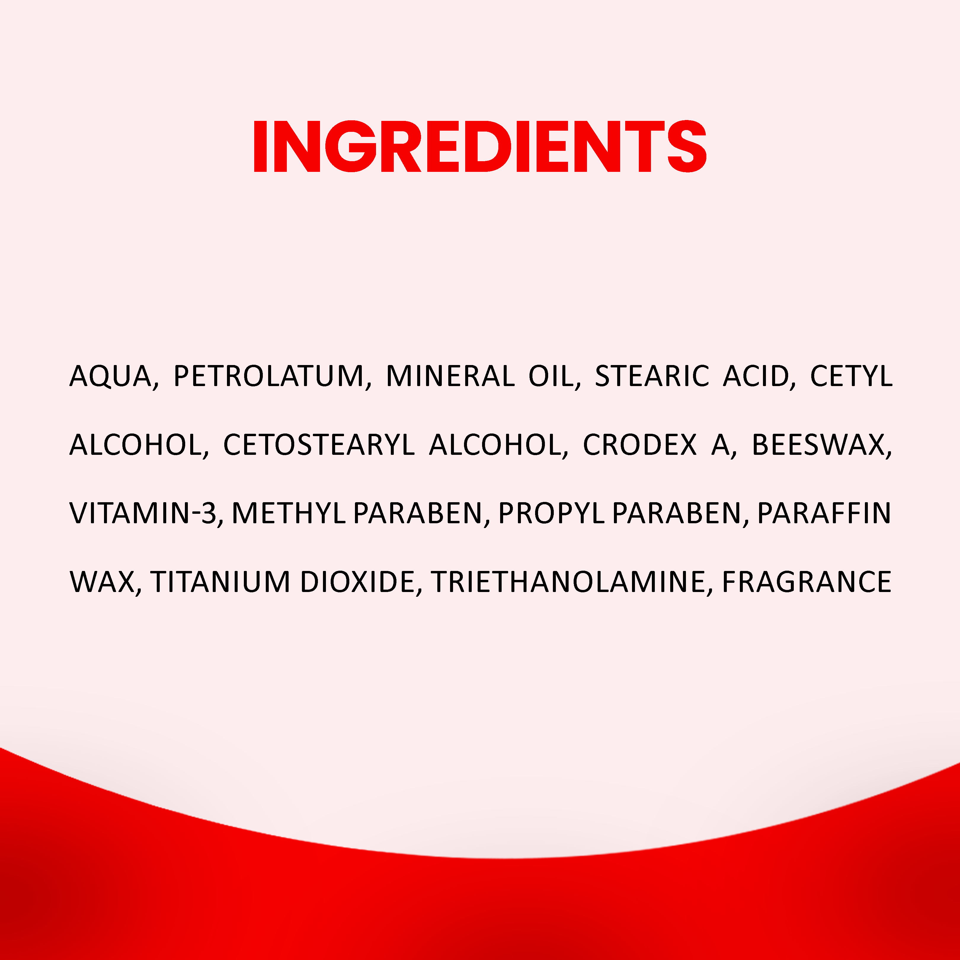 Ingredients: Aqua, Petrolatum, Mineral oil, Stearic acid, Cetyl alcohol, Cetostearyl alcohol, Crodex A, Beeswax, Vitamin 3, Methyl Paraben, Propyl Paraben, Paraffin Wax, Titanium Dioxide, TriethanolAmine & Fragrance.