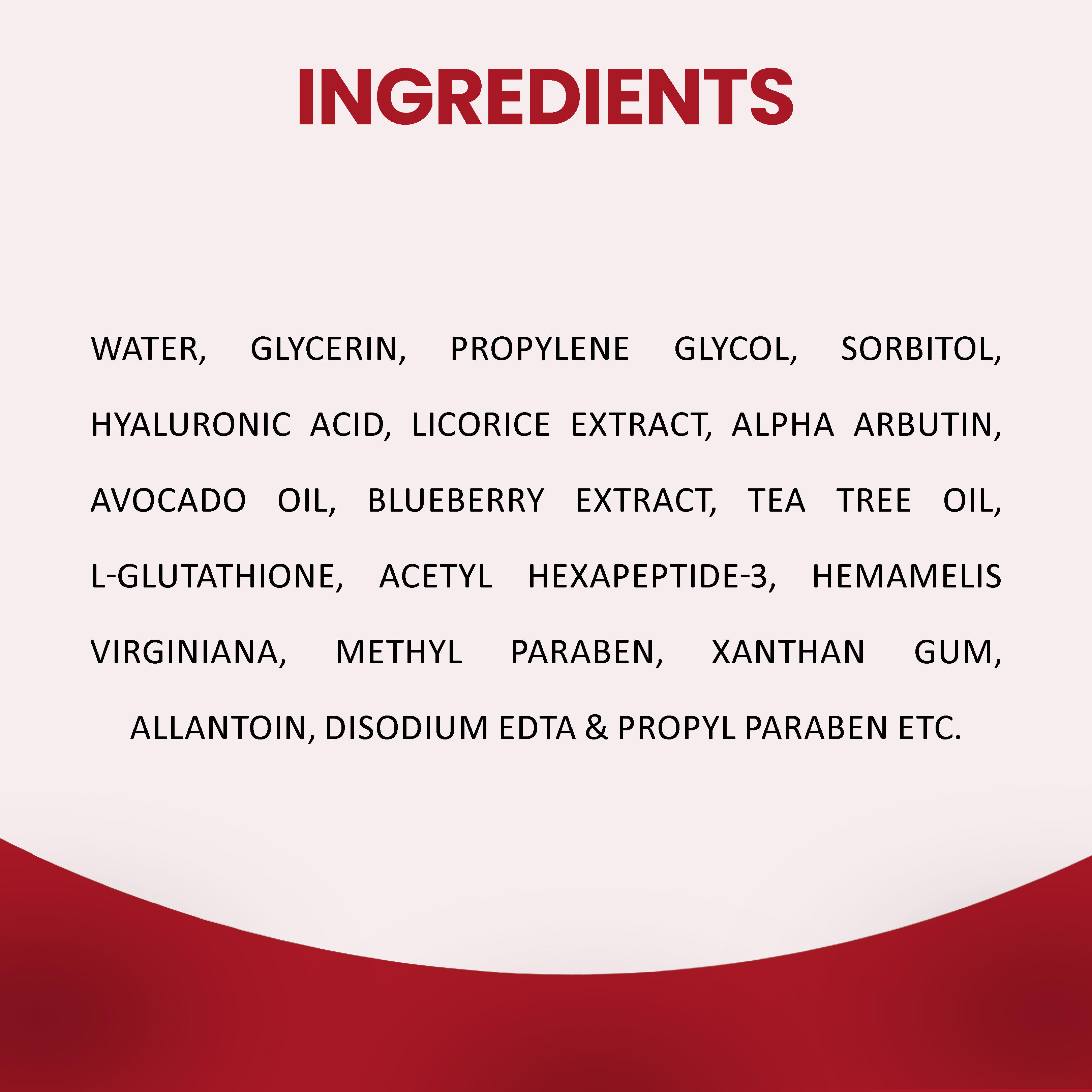 INGREDIENTS: Water, Glycerin, Propylene Glycol, Sorbitol, Hyaluronic Acid, Licorice Extract, Alpha Arbutin, Avocado Oil, Blueberry Extract, Tea Tree Oil, L-Glutathione, Acetyl Hexapeptide-3, Hemamelis Virginiana, Methyl Paraben, Xanthan Gum, Allantoin, Disodium EDTA & Propyl Paraben Etc.